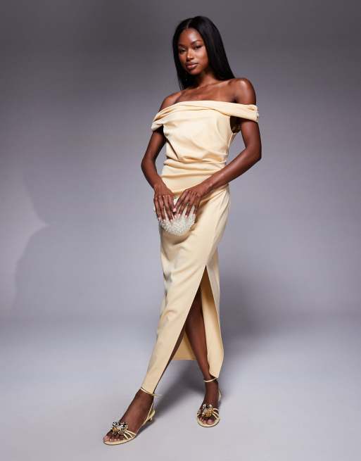 Vestido midi amarillo claro ajustado con escote Bardot retorcido de ASOS DESIGN
