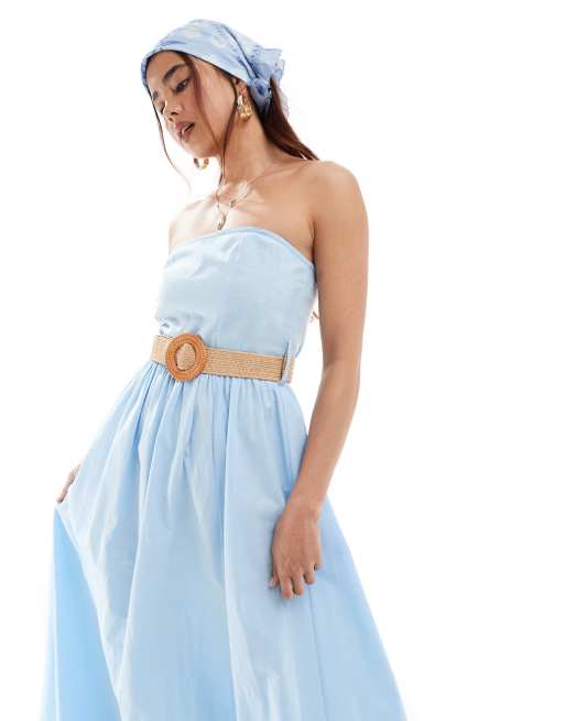 Vestido midi azul pastel con escote palabra de honor, cinturón y falda de corte amplio de mezcla de lino de ASOS DESIGN