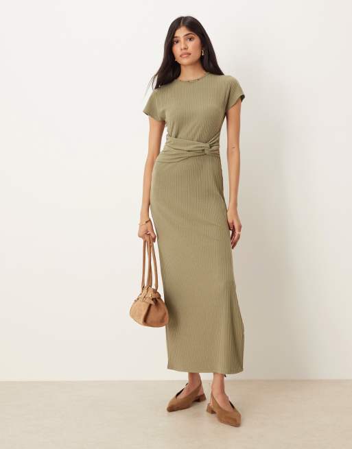 Vestido midi caqui de manga corta con detalle anudado en la cintura de canalé de ASOS DESIGN