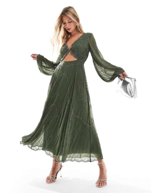 Vestido midi caqui oscuro de manga larga con abertura y diseño adornado de ASOS DESIGN