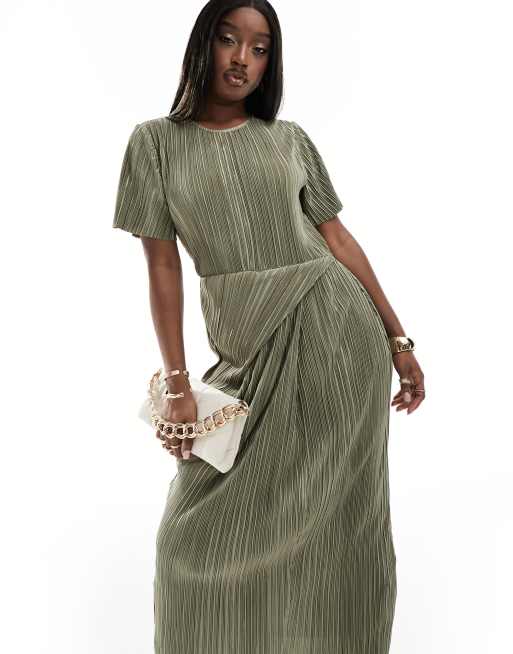 Vestido midi caqui plisado de manga corta con detalle retorcido en la falda de ASOS DESIGN