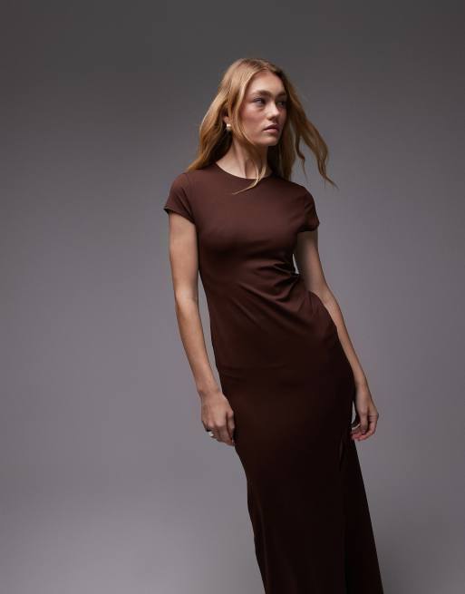 Vestido midi color chocolate con mangas de casquillo, laterales fruncidos y abertura delantera de ASOS DESIGN