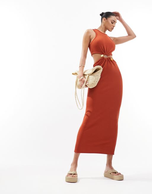 Vestido midi color óxido con aberturas y detalle de piedras de canalé de ASOS DESIGN