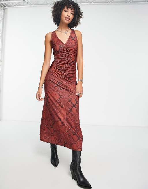 Vestido midi color óxido sin mangas con detalle fruncido y estampado de serpiente de ASOS DESIGN
