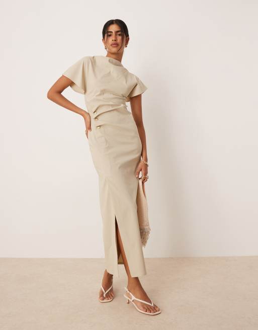 Vestido midi color piedra con cintura fruncida de bengalina de ASOS DESIGN