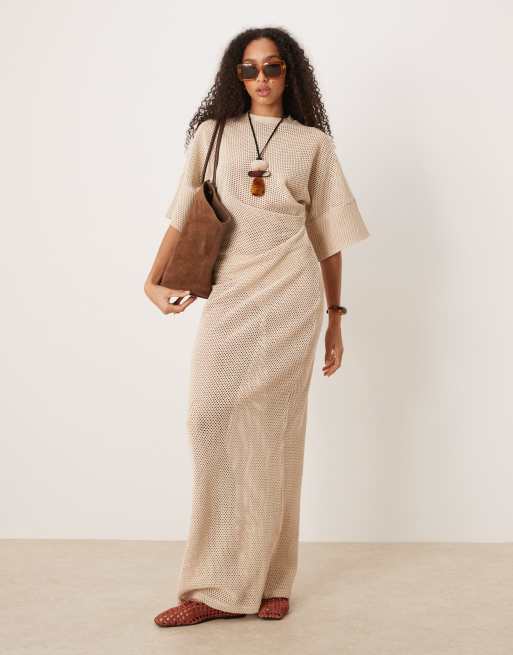 Vestido midi color piedra estilo camiseta con cintura recogida de croché de ASOS DESIGN