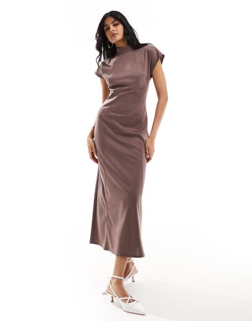 Vestido midi color topo con cuello alto, mangas de casquillo y detalle de costuras de ASOS DESIGN