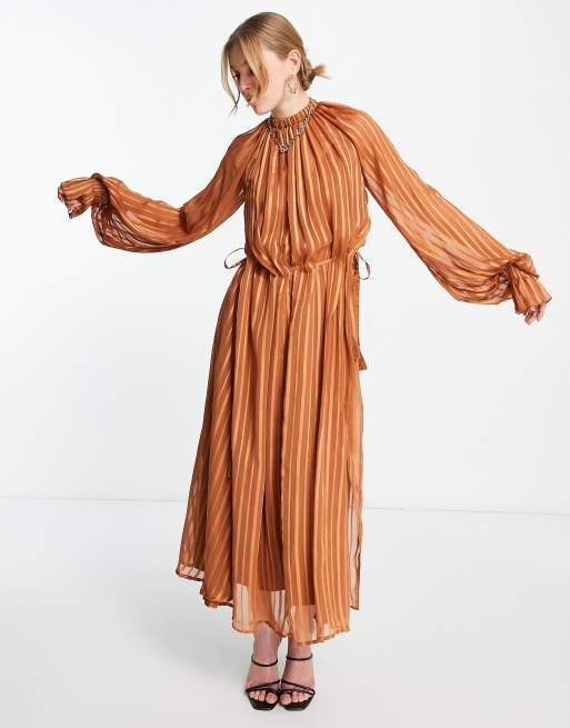 Vestido midi con cuello alto, detalle fruncido y raya de satén de ASOS DESIGN