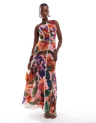 Vestido midi con estampado floral luminoso, costuras a la vista y espalda al aire de malla de ASOS DESIGN