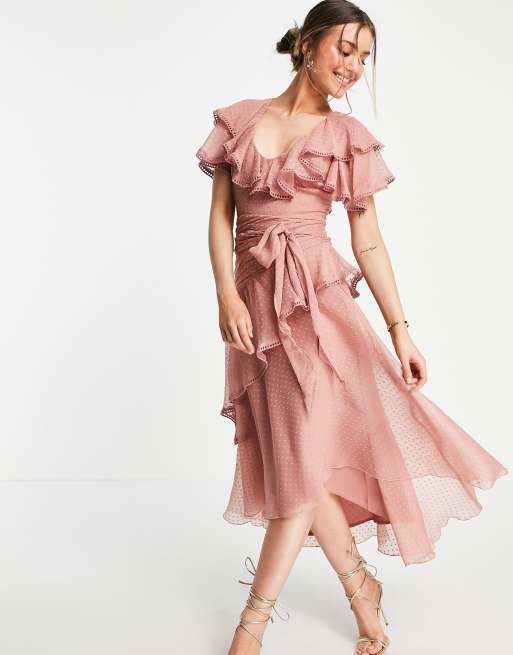 Vestido midi drapeado con detalle anudado de plumeti de chifón de ASOS DESIGN