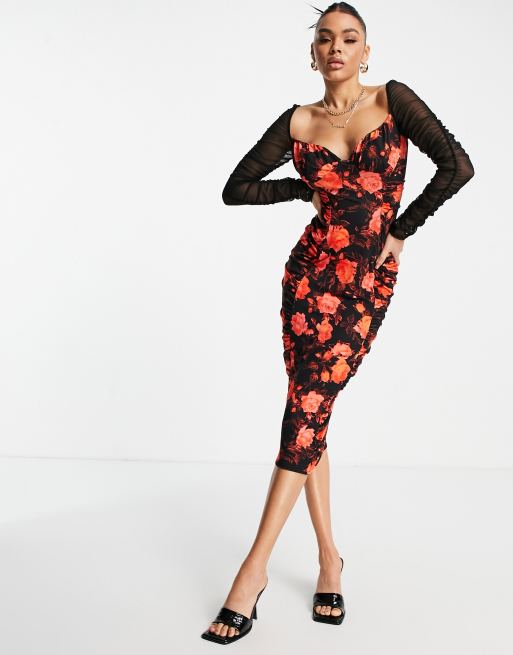 Vestido midi fruncido de manga larga con estampado floral rojo pintado y copas de malla de ASOS DESIGN