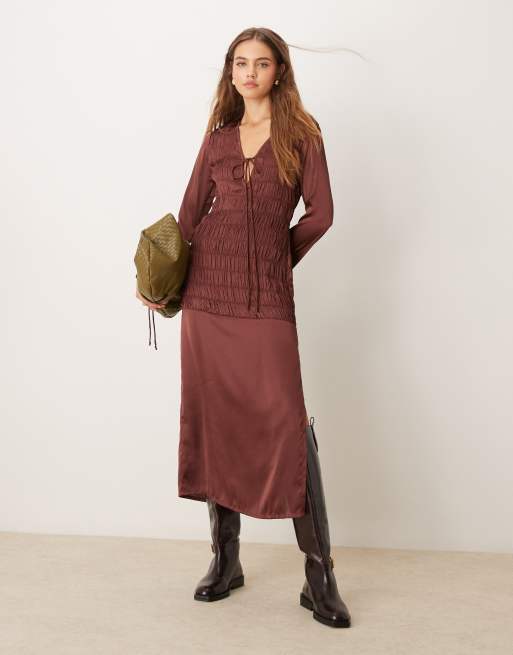 Vestido midi marrón chocolate fruncido con detalle de lazada delantera de satén de ASOS DESIGN