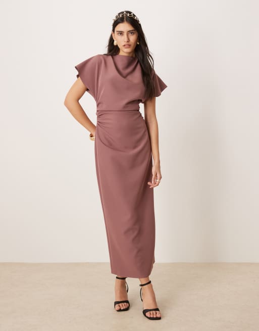 Vestido midi marrón rosado con mangas de hombro caído, cuello alto y detalle de abertura en la espalda de ASOS DESIGN