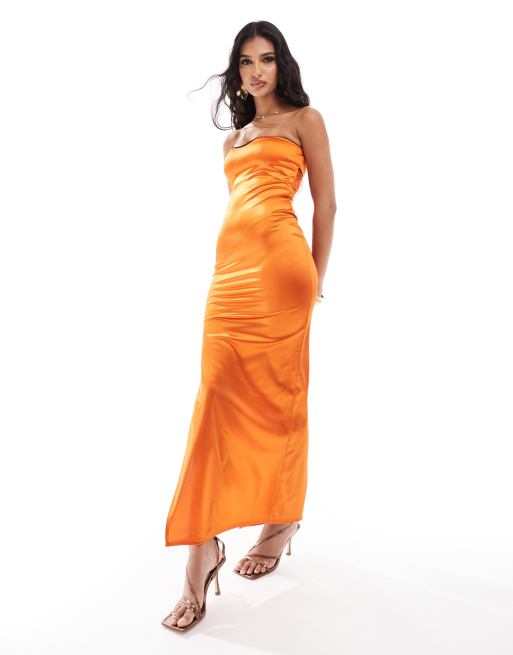 Vestido midi naranja luminoso ajustado de satén elástico con ribete de puntilla de ASOS DESIGN
