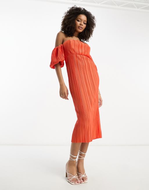 Vestido midi naranja mandarina plisado con escote Bardot y mangas abullonadas de tejido texturizado de ASOS DESIGN