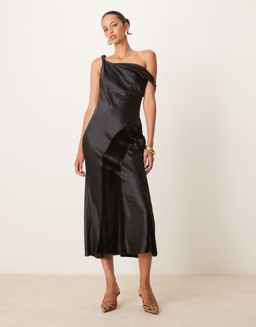Vestido midi negro con escote Bardot y detalle retorcido de terciopelo y satén de ASOS DESIGN