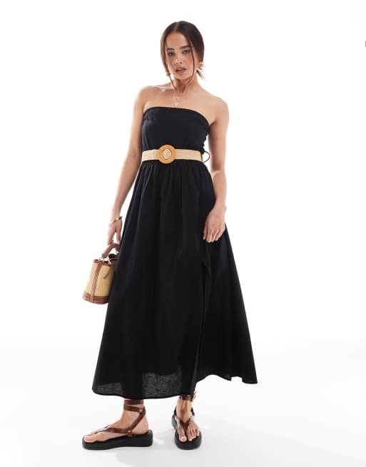 Vestido midi negro con escote palabra de honor, cinturón y falda de corte amplio de mezcla de lino de ASOS DESIGN