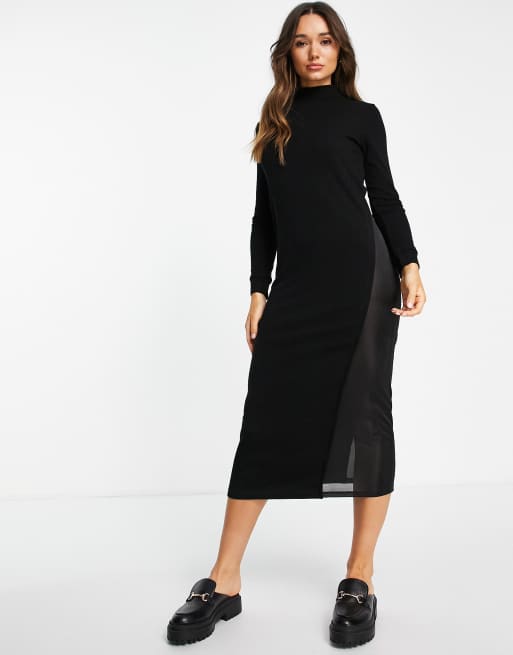 Vestido midi negro de manga larga con aplicaciones de satén de canalé de ASOS DESIGN