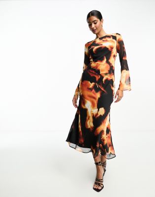 Vestido midi negro de manga larga con diseño estampado de chifón de ASOS DESIGN
