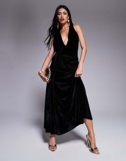 Vestido midi negro muy escotado con detalle de abertura drapeada de terciopelo de ASOS DESIGN