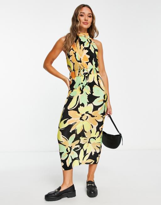Vestido midi negro y verde lima plisado sin mangas con estampado floral, cuello alto y cinturón de ASOS DESIGN
