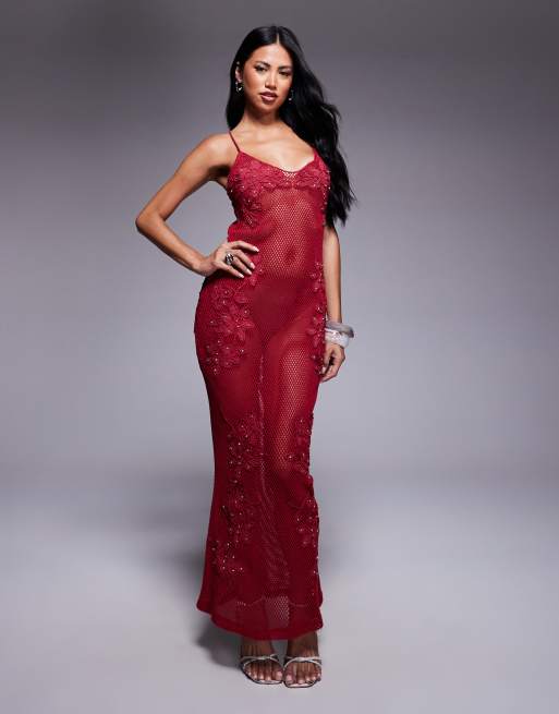 Vestido midi rojo baya de tirantes de croché con flores bordadas y detalles de strass de ASOS DESIGN