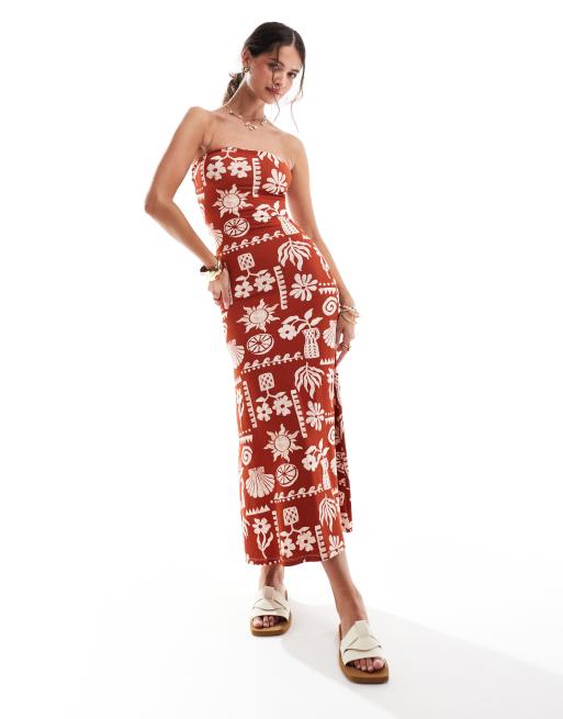 Vestido midi rojo de corte trapecio con escote palabra de honor y estampado de postal de ASOS DESIGN