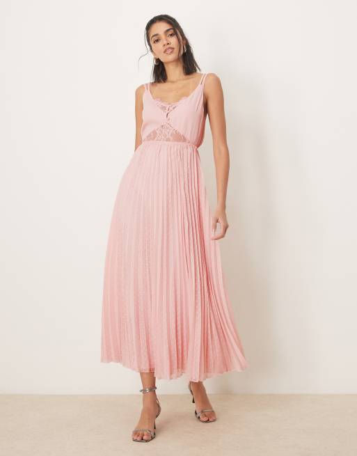Vestido midi rosa claro plisado con diseño de dos capas e inserto de encaje de ASOS DESIGN