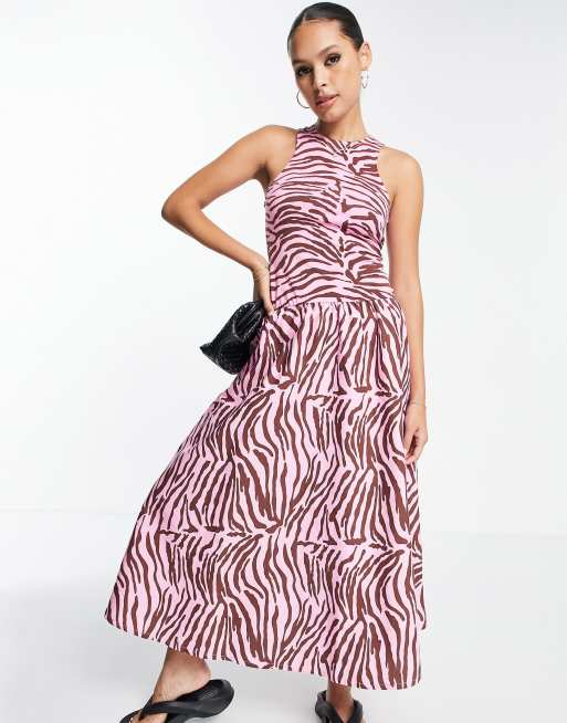 Vestido midi rosa con estampado de cebra, parte delantera estilo nadadora y cintura caída de mezcla de popelina de ASOS DESIGN