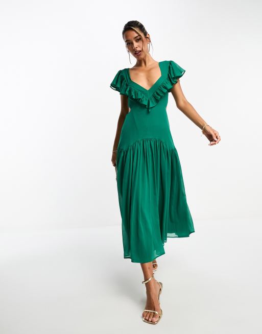 Vestido midi verde bosque con volantes, mangas acampanadas y espalda abierta de ASOS DESIGN