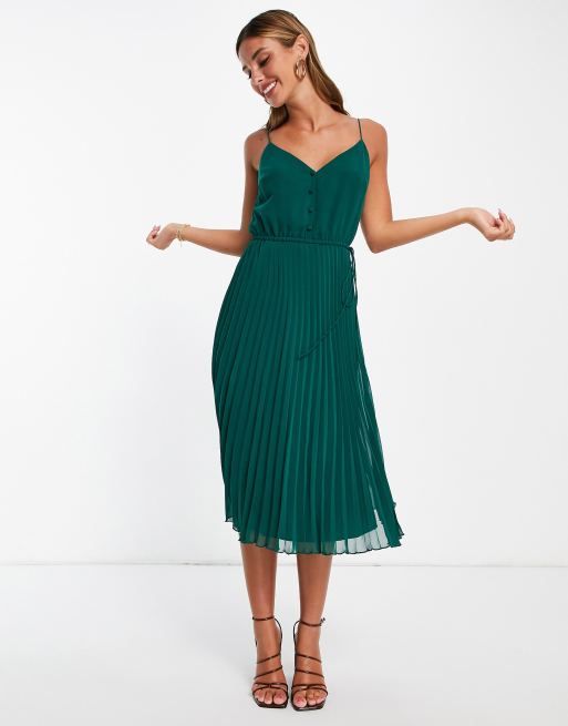 Vestido midi verde bosque de tirantes con botones en la parte delantera, falda plisada y cordón ajustable en la cintura de ASOS DESIGN