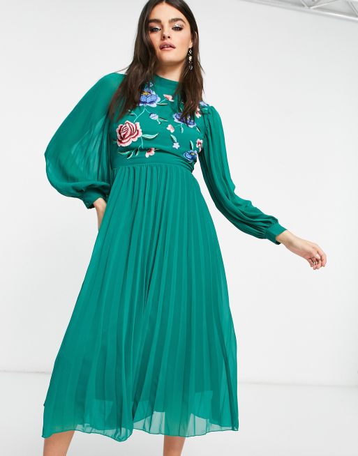 Vestido midi verde bosque plisado de manga larga y corte skater con cuello alto y bordados de ASOS DESIGN