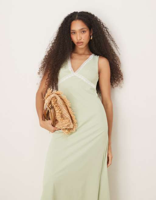 Vestido midi verde salvia con parte delantera de pico e insertos de encaje de ASOS DESIGN
