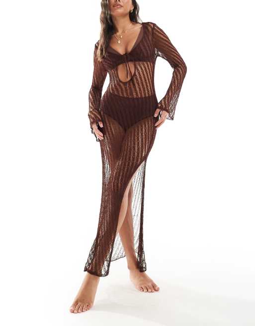 Vestido playero largo marrón de manga larga con lazada delantera de punto de ASOS DESIGN