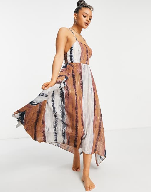 Vestido playero midi con estampado tie dye de tonos tierra con bajo vaporoso de ASOS DESIGN