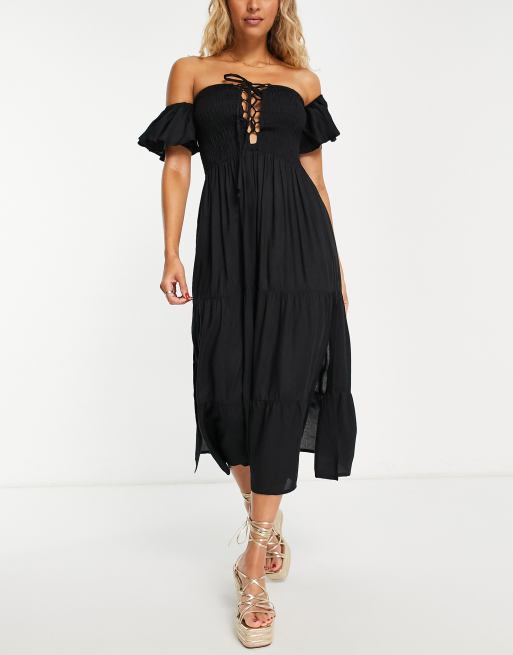 Vestido playero semilargo negro con escote Bardot y cintura fruncida de ASOS DESIGN