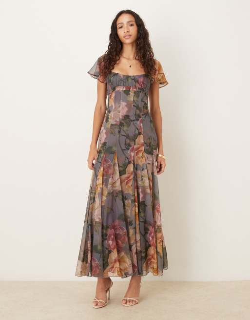 Vestido semilargo azul con estampado floral extragrande, pecho fruncido, mangas fluidas y falda de godets de ASOS DESIGN