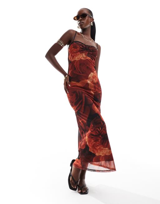 Vestido semilargo de malla con estampado de rosa, detalle fruncido y ribete de puntilla de ASOS DESIGN