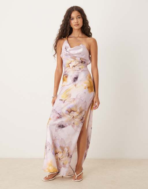 Vestido semilargo de tirantes asimétricos con estampado floral extragrande y abertura de satén de ASOS DESIGN