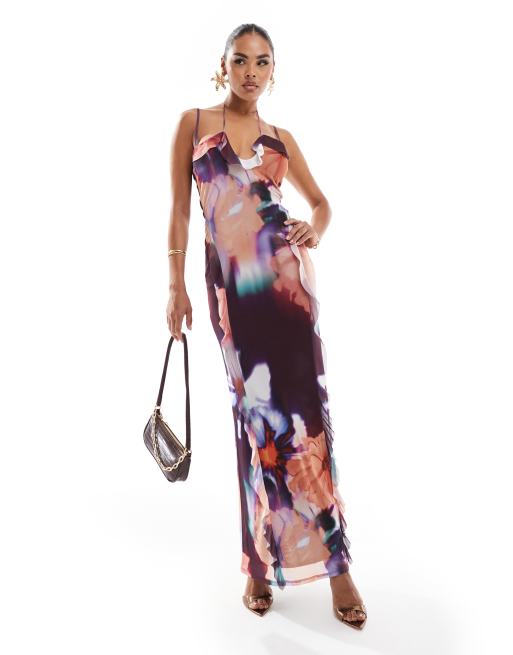 Vestido semilargo morado con estampado floral, detalle de volante y costuras de malla de ASOS DESIGN