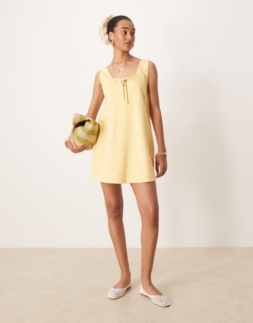 Vestido vaquero corto amarillo pastel con cuello ancho y lazo delantero de ASOS DESIGN