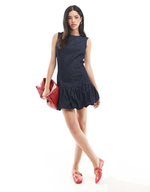 Vestido vaquero corto azul añil enjuagado con falda abullonada y cintura baja de ASOS DESIGN