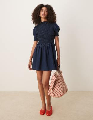 Vestido vaquero corto con acabado enjuagado, parte delantera fruncida y mangas abullonadas de ASOS DESIGN