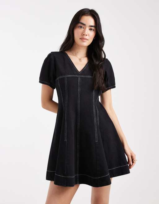 Vestido vaquero corto negro con cuello de pico y detalle de costuras de ASOS DESIGN