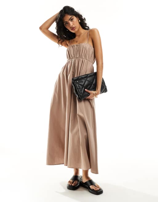 Vestido veraniego largo color piedra con pecho fruncido y tirantes regulables de ASOS DESIGN