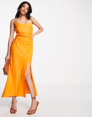 Vestido veraniego largo naranja de tirantes con abertura de lino de ASOS DESIGN