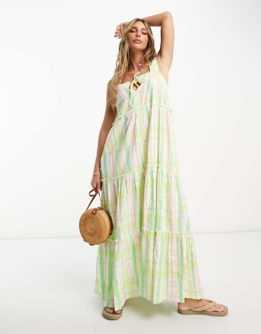 Vestido veraniego largo verde a cuadros escalonado con borde sin rematar y detalle de lazada de ASOS DESIGN