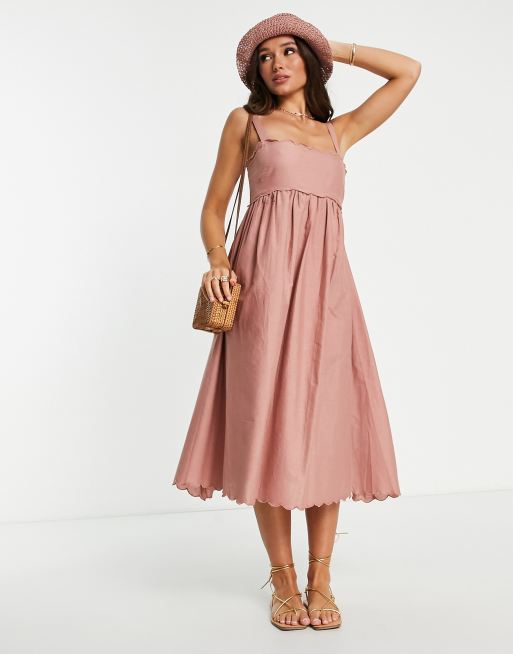 Vestido veraniego midi rosa negruzco con bordes festoneados y abertura en la espalda de ASOS DESIGN