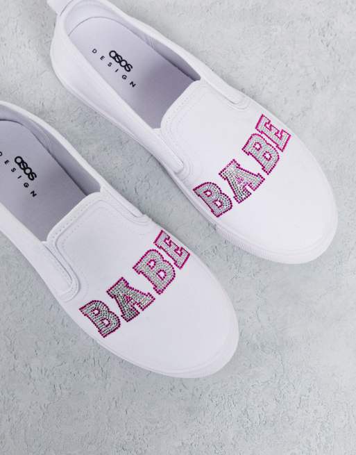 Zapatillas sin cierres de lona con detalle de texto "Babe" de abalorios termosellados Dotty de ASOS DESIGN