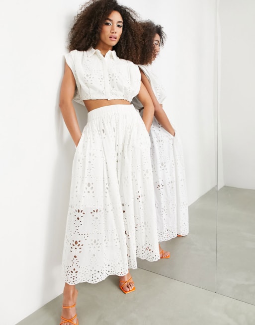 Conjunto blanco de camisa corta bordada y falda midi bordada con cintura plisada de ASOS EDITION